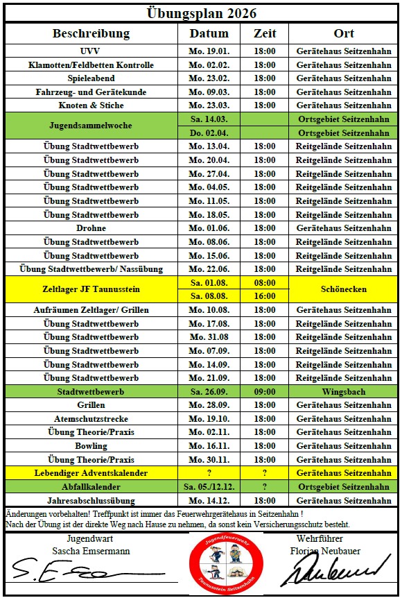 Nachfolgend finden Sie den Termin- und Übungsplan der Jugendfeuerwehr für das Jahr 2026, der auch hier als PDF-Datei heruntergeladen werden kann: